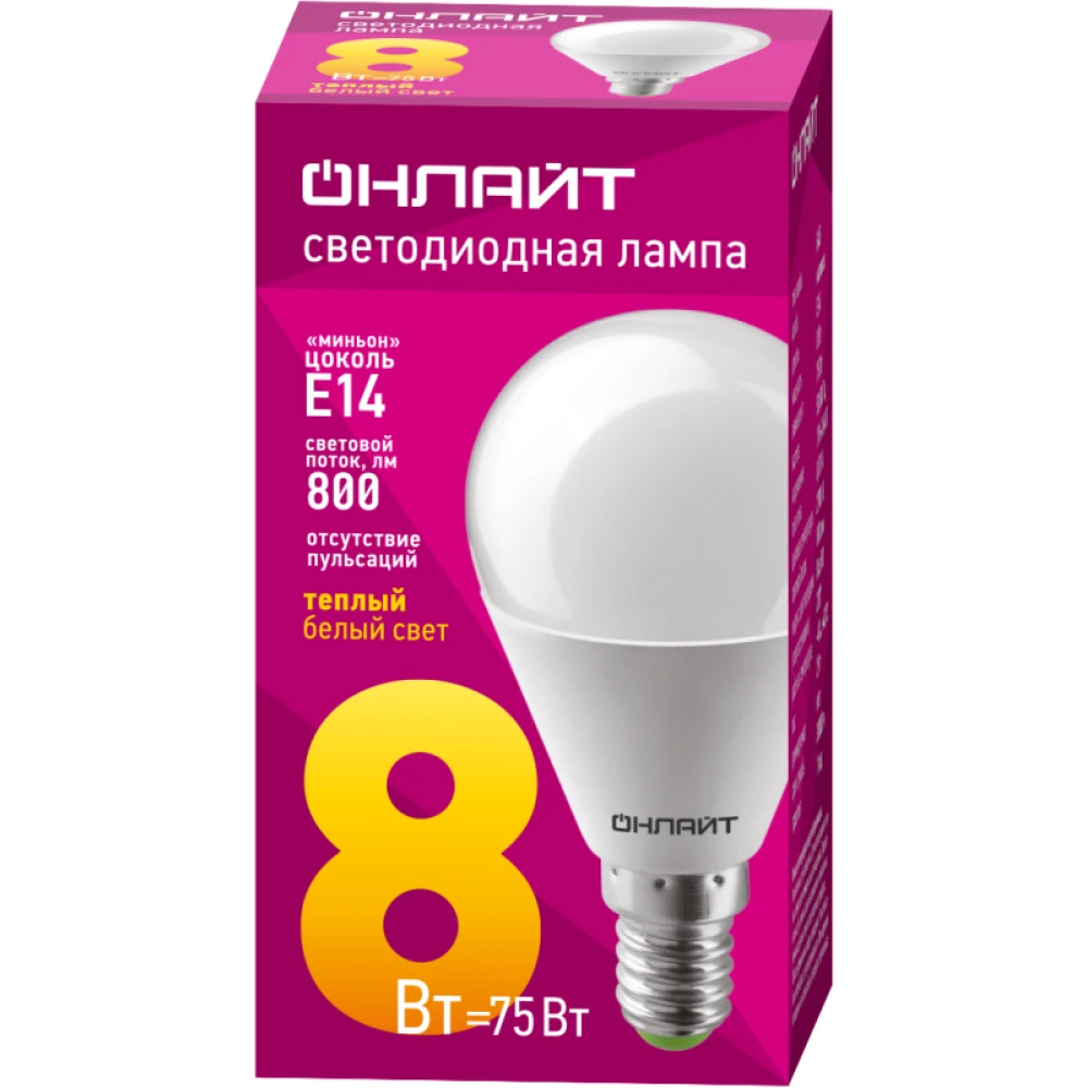 Лампа светодиодная 71 624 OLL-G45-8-230-2.7K-E14 ОНЛАЙТ 4670004716243 – лампа с колбой вида "шар", теплого белого света, длиной 78 мм, с цоколем Е14, мощностью 8 Вт. Цветовая температура 2700 К.